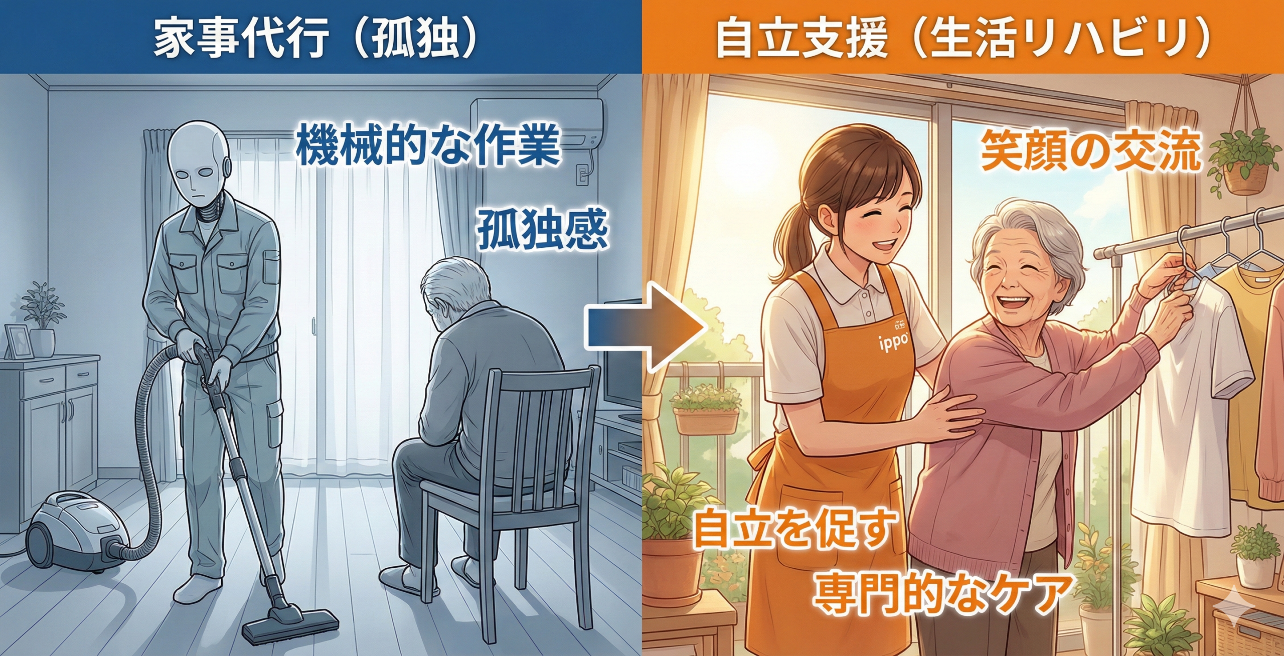 確かにそれも大切ですが、私たち「訪問介護 いっぽ」は、そこにもう一つ、「できる能力を維持・向上させる」という専門的な目的を持たせています。