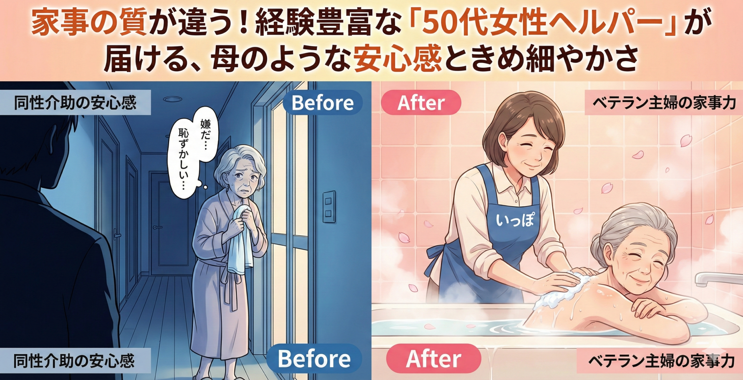 - 🛁 入浴介助:裸を見られる心理的負担を軽減し、リラックスしてバスタイムを楽しんでいただけます。